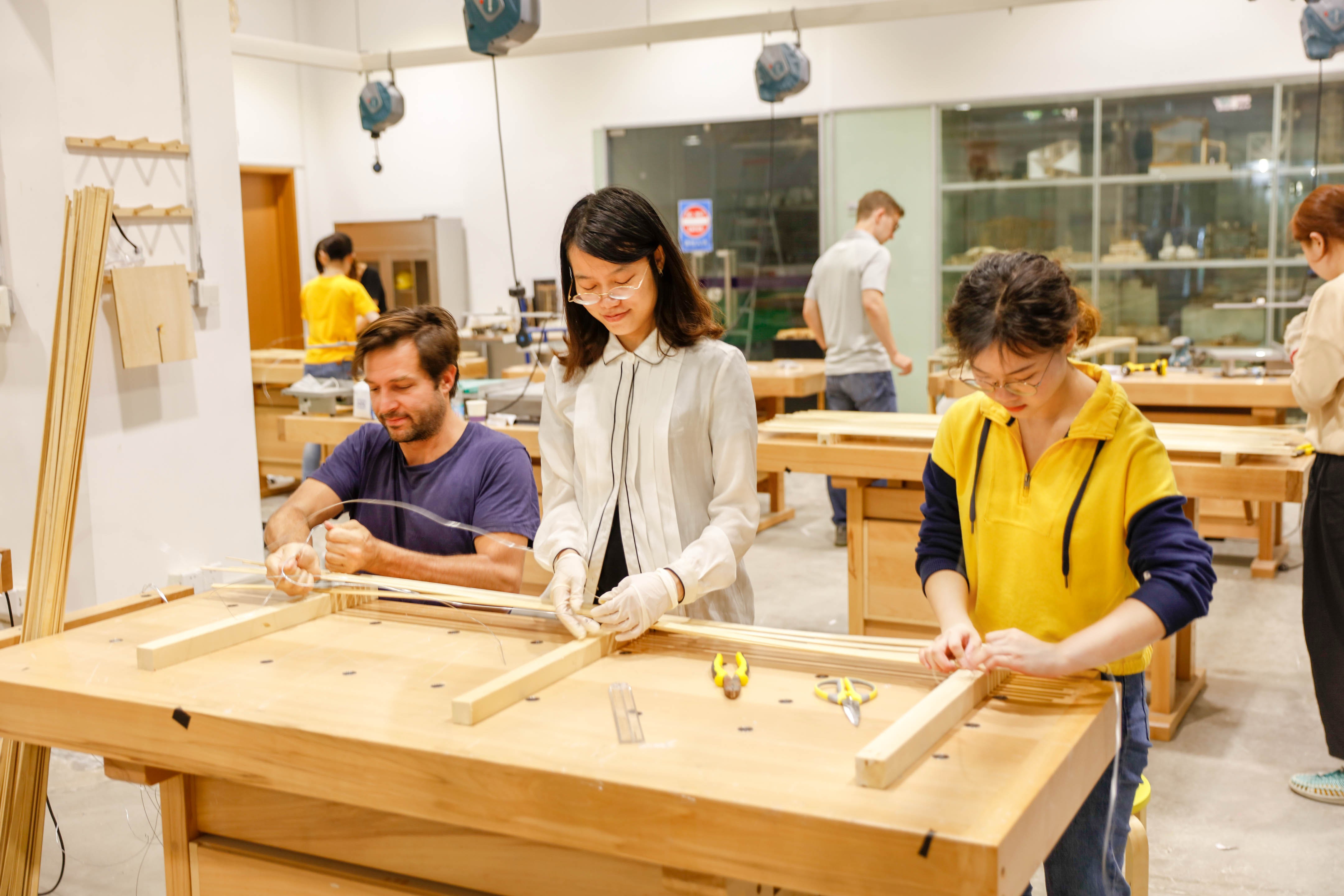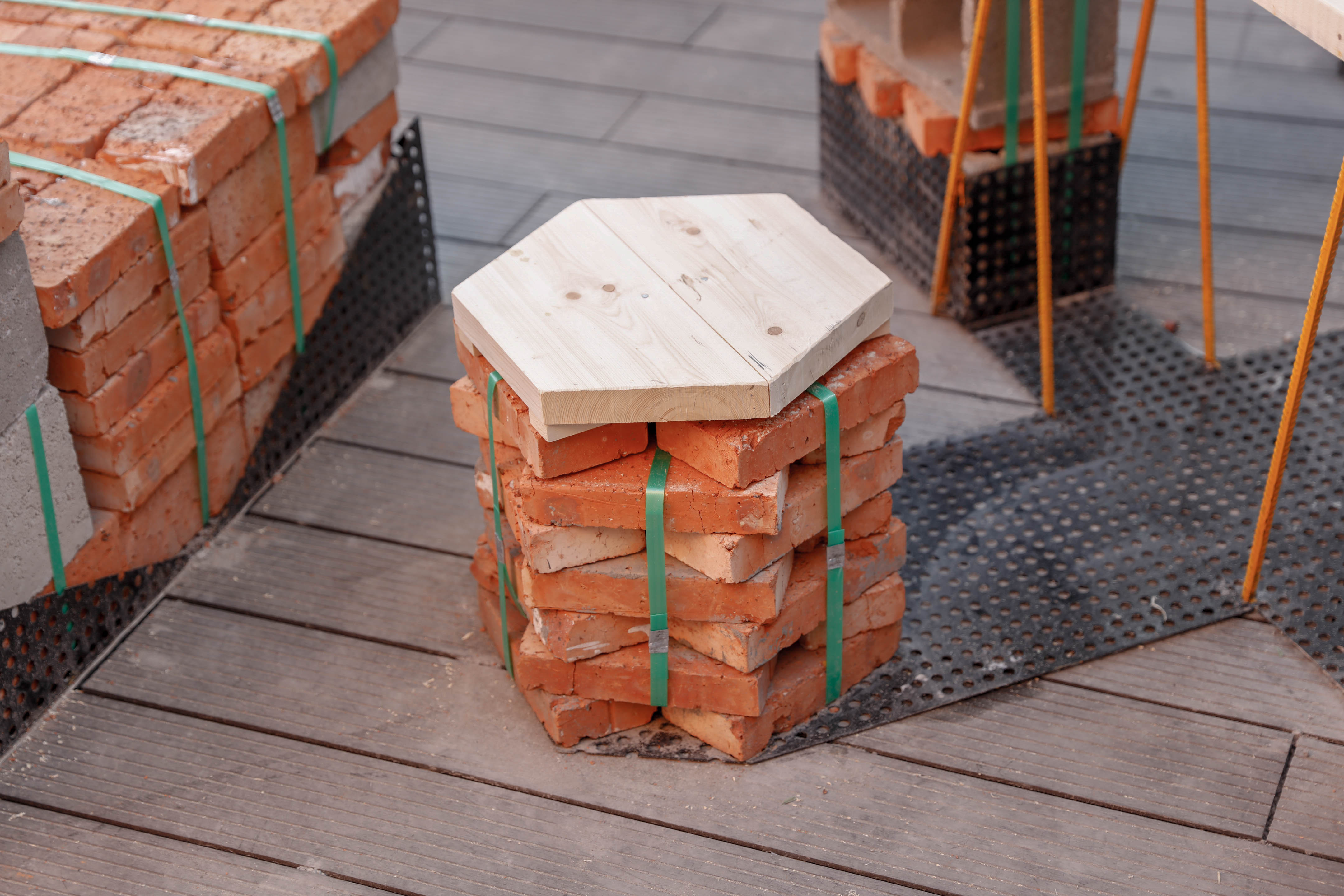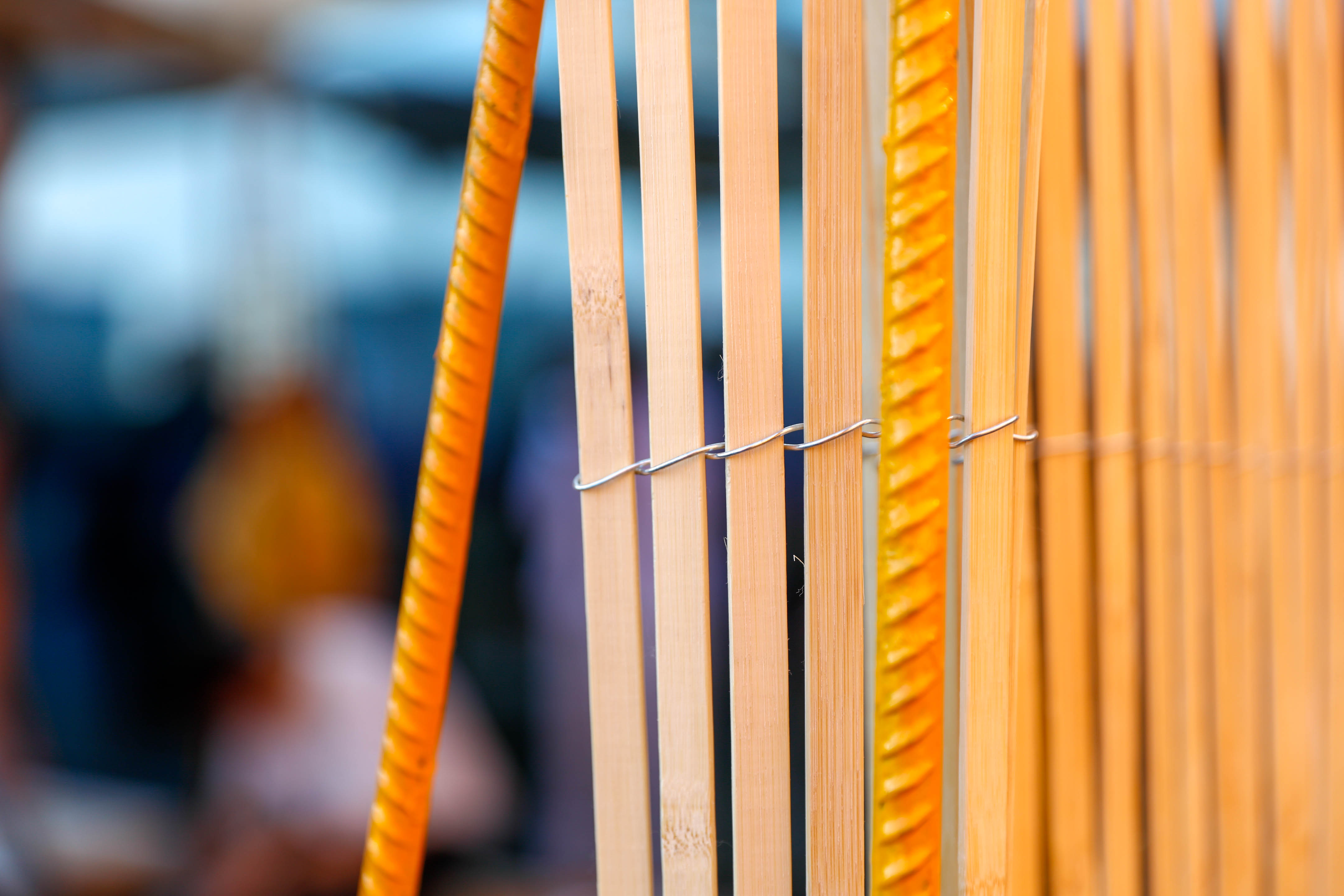 In the workshop we are divided into groups and manage build a pavilion through various recycled materials such as bricks, steels, bamboo battens and wood. Steels and Wood are built as loading structure, while a shelter is made by weaving bamboo battens. The building was on the roof plantform of school, which aims to provide student a space to rest and take foods.
